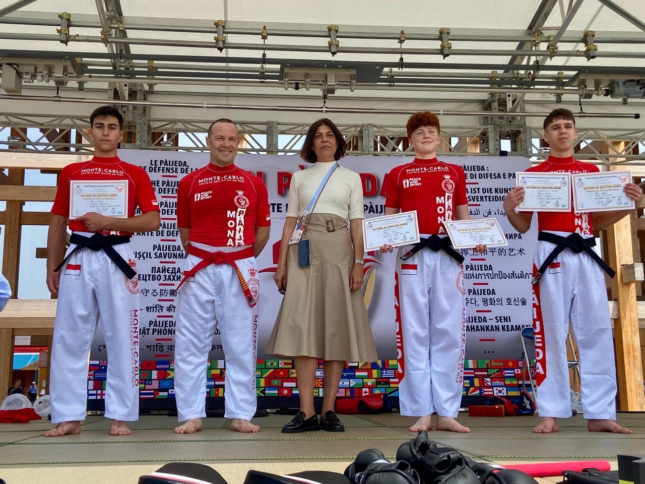 A l’issue, des démonstrations conduites par Claude Pouget, assisté de Raphaël Delgado, Romain Solerieu et Gabriel Lugano, âgés de 16 et 17 ans, ayant eu à cœur de mettre à l’honneur la Principauté de Monaco ainsi que l’identité du Pàijeda, art martial monégasque, celui-ci leur a fait la surprise de leur décerner leurs diplômes de ceinture noire de Pàijeda, art martial monégasque et de Kickboxing, en cette belle occasion, ayant finalisé ce jour-là leur examen, après plusieurs années de pratique.