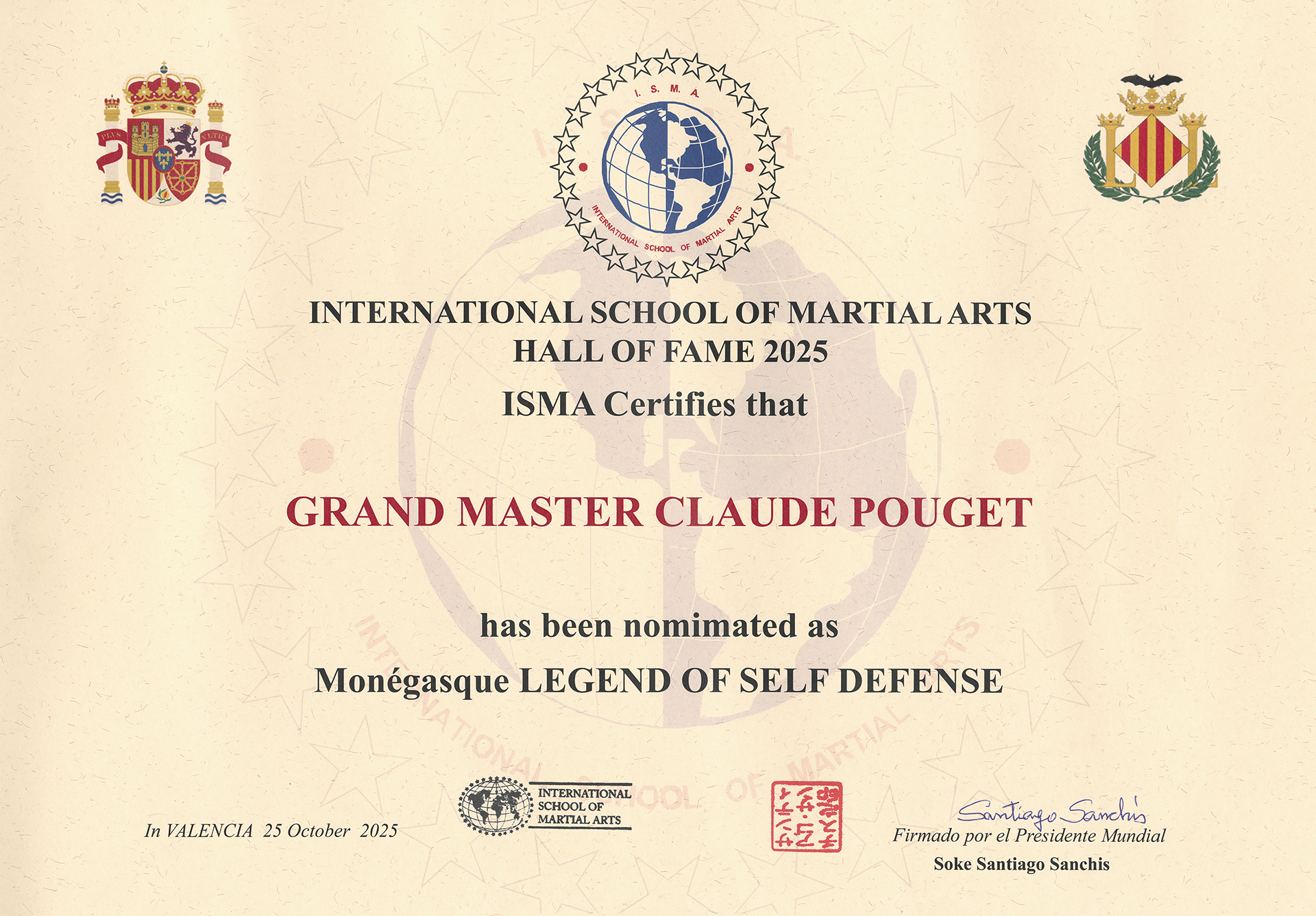 Claude Pouget a été, à plusieurs reprises, honoré, depuis 2010, au « Hall of Fame » de Valence en Espagne, organisé par la Société internationale d’arts martiaux (I.S.M.A.), présidé par le Soke Sanchis, obtenant notamment les distinctions de « Légende monégasque de Self-Defense » (2025) et d’arts martiaux (2023), précédées du grade de 10ème Dan en Self Défense I.S.M.A.(2024), des titres de « Grand Master » d’arts martiaux (2015) et de Self-Défense (2017).